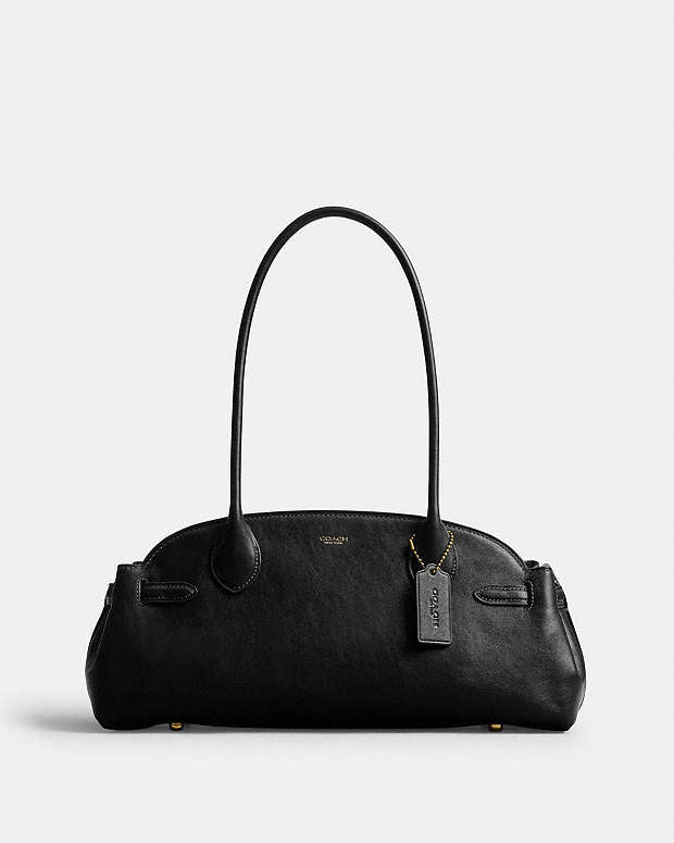 Reveal Coach's Empire carryall 34 glazed leather shoulder bag. Crafted from smooth leather, it features a decorative label with an embossed "Coach" logo. Designed with double handles and a secure zipper closure, its visible topstitching and gold finish provide a touch of refined sophistication
